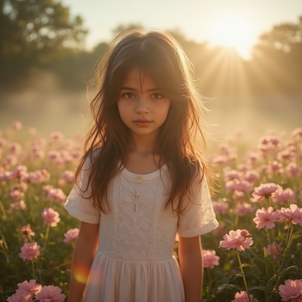 a dreamy girl with long hair and soft expression, standing in a blooming garden, morning mist, golden hour light, ultra-realistic, beautiful color tones, pastel flowers, cinematic clarity, glowing atmosphere, hyperrealistic portrait