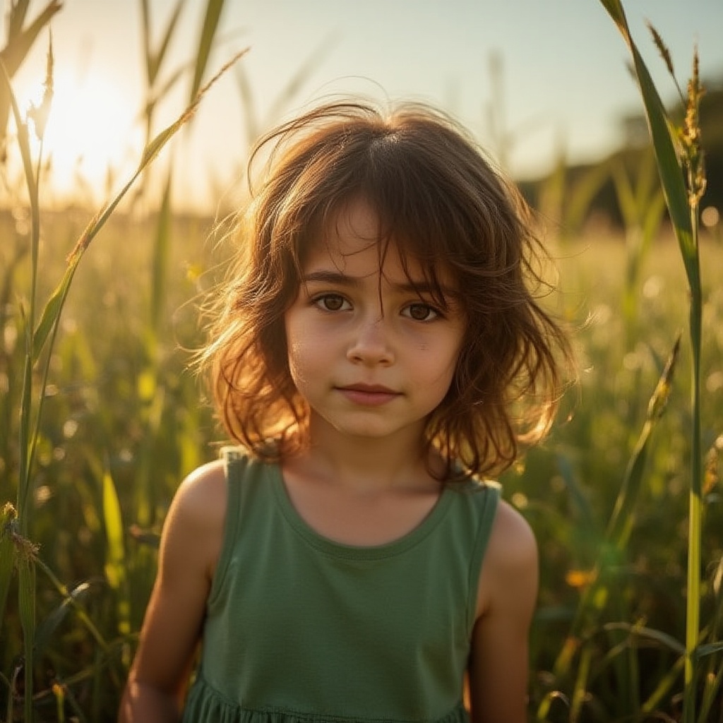a girl in a green dress surrounded by tall grass, golden hour sunlight, ultra-realistic texture, natural soft light, serene expression, warm tones, sharp focus, outdoor photography style, realistic colors, shallow depth of field