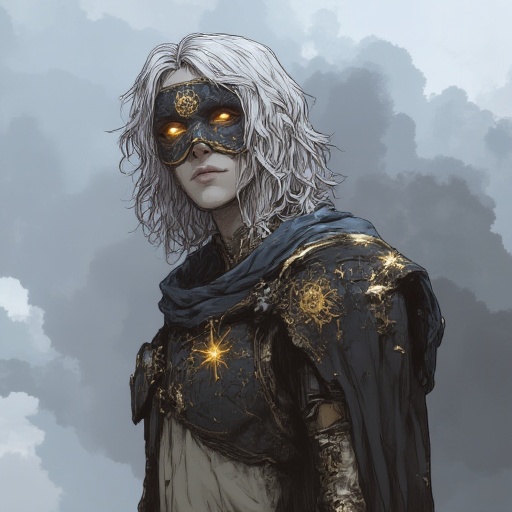in the style of cksc,, Stylized illustrative noir, strong line art, bold color palettes, dynamic contrasts, atmospheric storytelling, detailed character designs, cinematic framing, varied settings including historical, fantasy, cyberpunk, and western themes, dramatic lighting, immersive environments., A male scourge Aasimar with golden skin, medium-length wavy platinum hair, and a small tattoo of the symbol of Solara, which is a simplified sun symbol with eight points. He should be wearing a simple, off-white tunic with scale mail armor bearing the same symbol of Solara as his tattoo. He has a mask similar to the one I uploaded with golden light emitting from it.