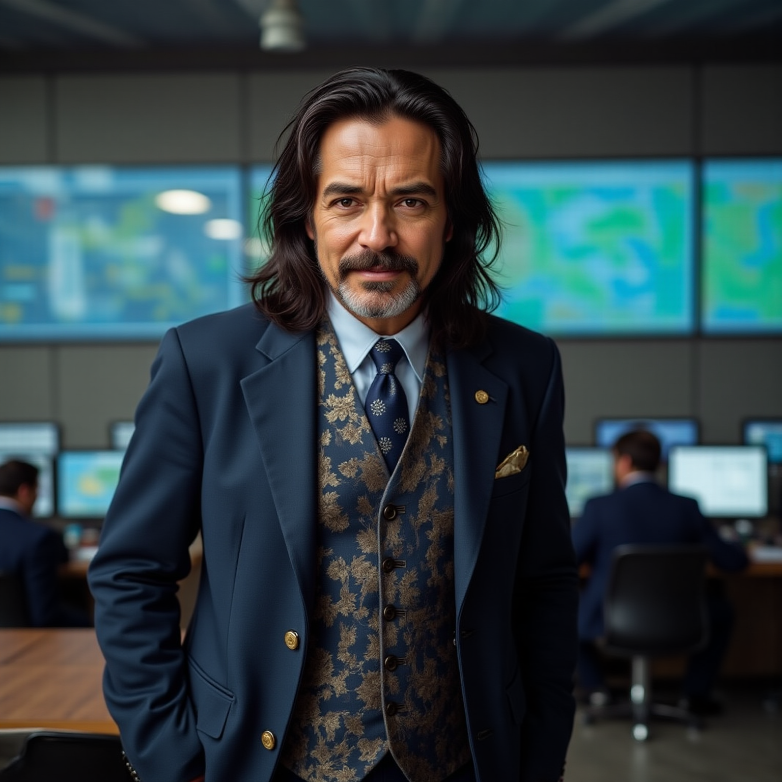 A 3/4 portrait photograph of a thin-faced thin man. He has very long dark brown hair and a short grey goatee beard and moustache. He is 66 years old. He is wearing a dark blue suit with a brocade waistcoat and a subdued gold tie. He has a very small simple circular gold lapel pin. He is standing relaxed with his hands in his trouser pockets. He is standing to one side in a high-tech control room.  The background is out of focus and shows people sitting at control stations. He has a slight welcoming smile . Realistic. Atmospheric. Detailed. Super Realism, UHD, photorealistic.