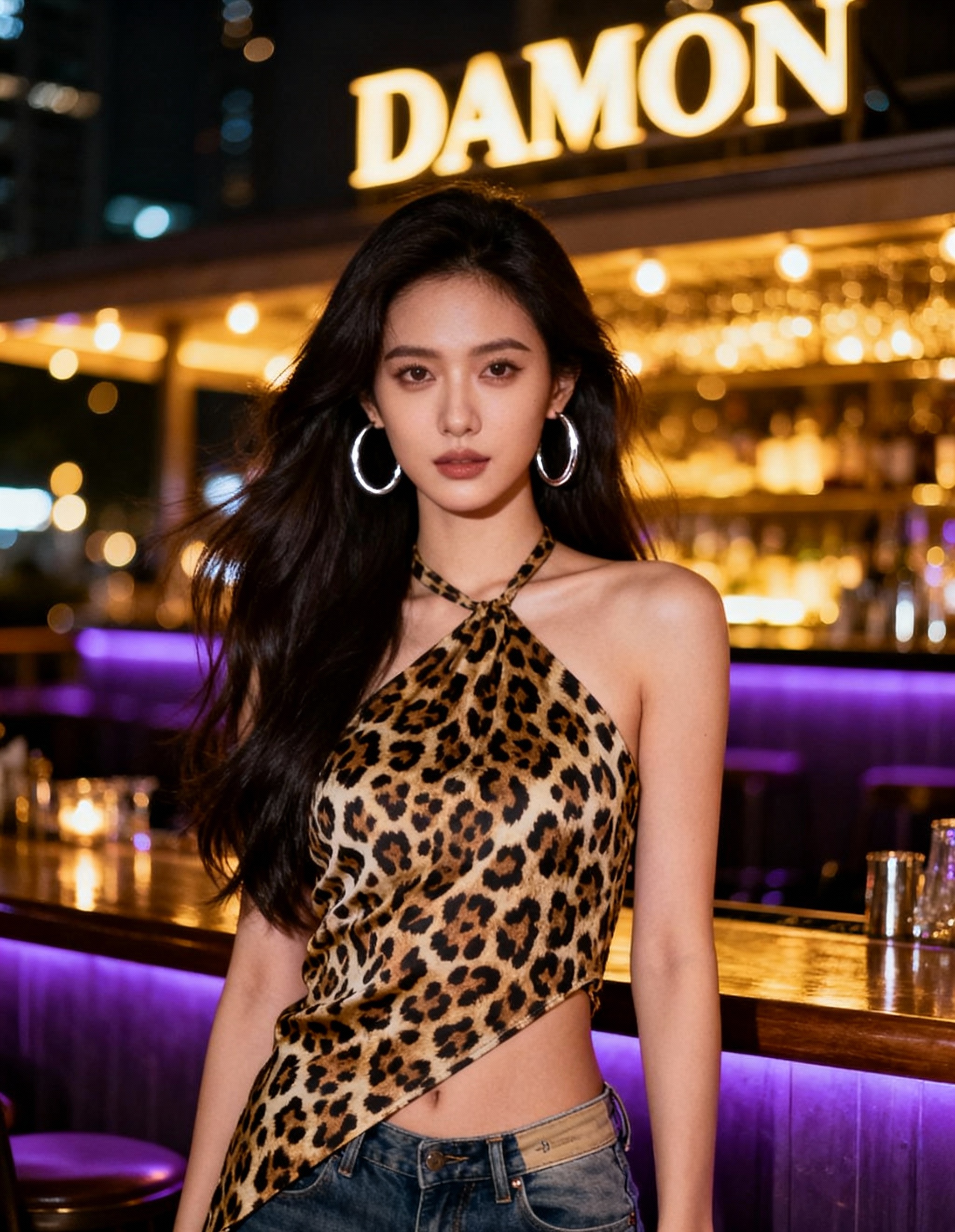 "caption": "A young woman with long, dark hair stands in front of a bar. She wears a leopard print halter top and blue jeans, accessorized with large hoop earrings. The bar features a purple backlit counter and a lit sign displaying 'DAMON' in yellow letters."