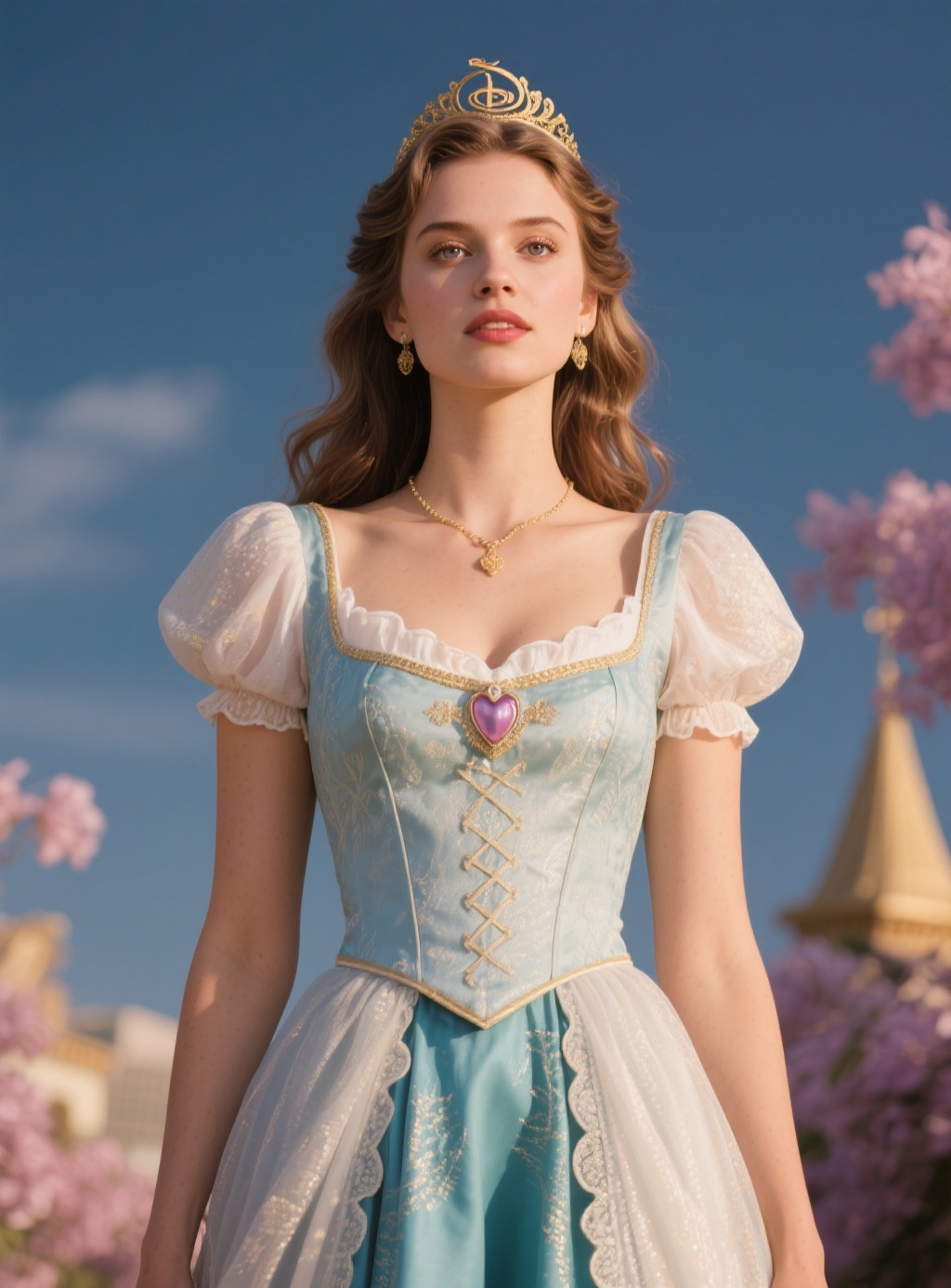 "answer": "The image shows a woman dressed in a princess costume, wearing a tiara and a necklace. She is standing in front of a building with cherry blossoms in the background. The woman is posing for the picture, looking directly at the camera. The scene evokes a sense of royalty and elegance, with the woman's attire and accessories suggesting a fairytale or fantasy setting."