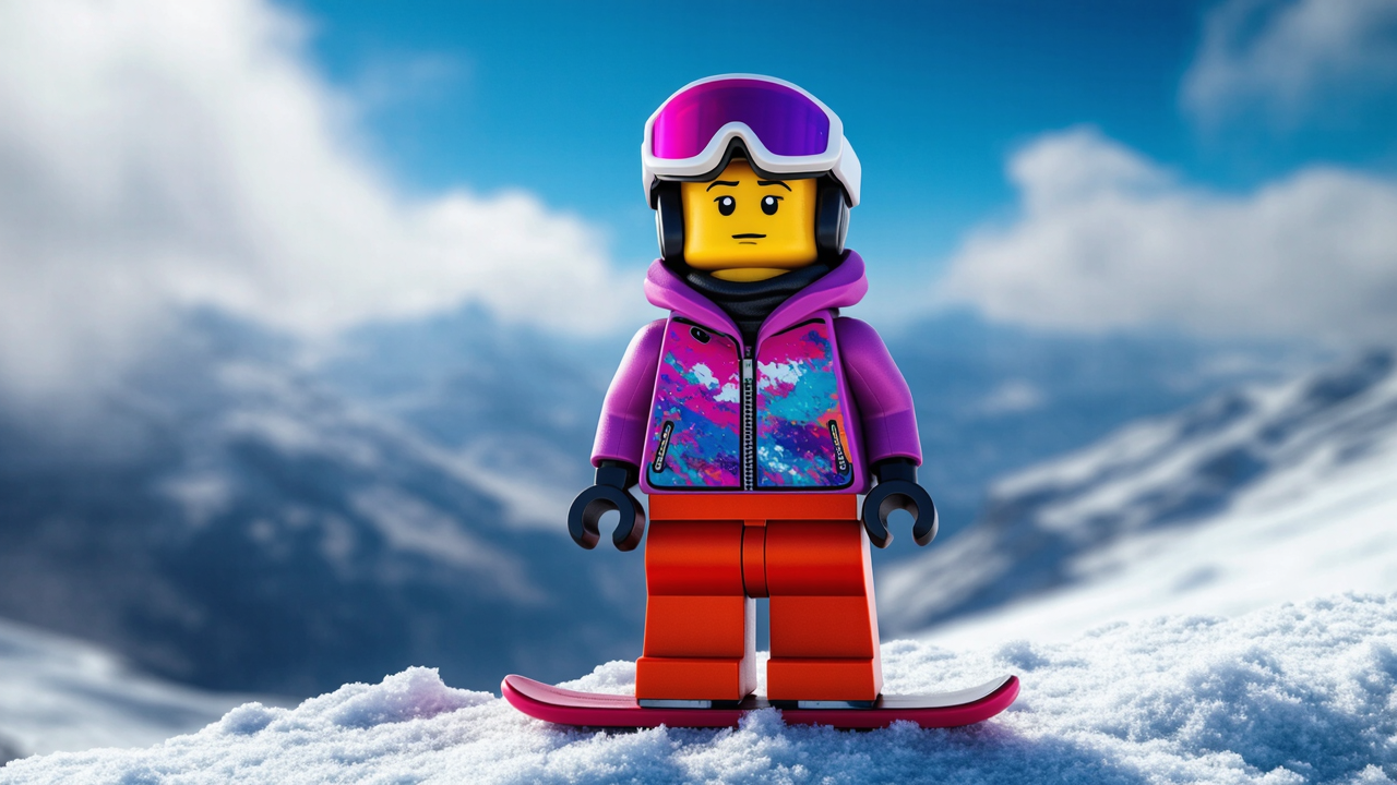 LEGO minifigure snowboarding on a mountain ridge, carving smooth S-turns while staying sideways on the board. The camera starts low in front, then rises and follows as the rider moves left and right across the slope. Snow sprays from the board, wind-blown powder in the air, dynamic action, smooth motion, stable framing, cinematic winter lighting.