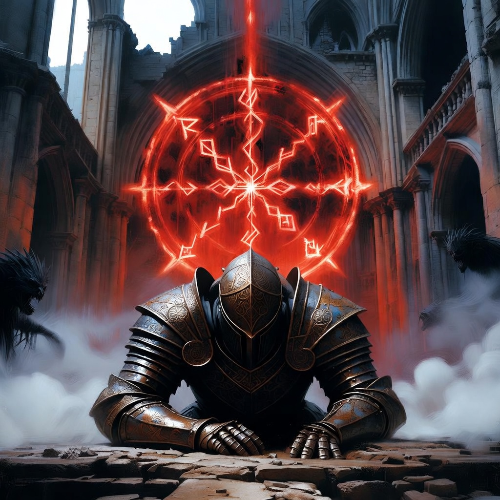 Dark fantasy concept art. A fallen knight in rusted, ornate armor kneeling in a ruined gothic cathedral. A massive, glowing red rune floats in the air above him. Fog rolls across the floor. Dramatic, high-contrast lighting. Shadows hide terrifying creatures in the corners. Oil painting texture, intricate details, cinematic composition, gloomy atmosphere.