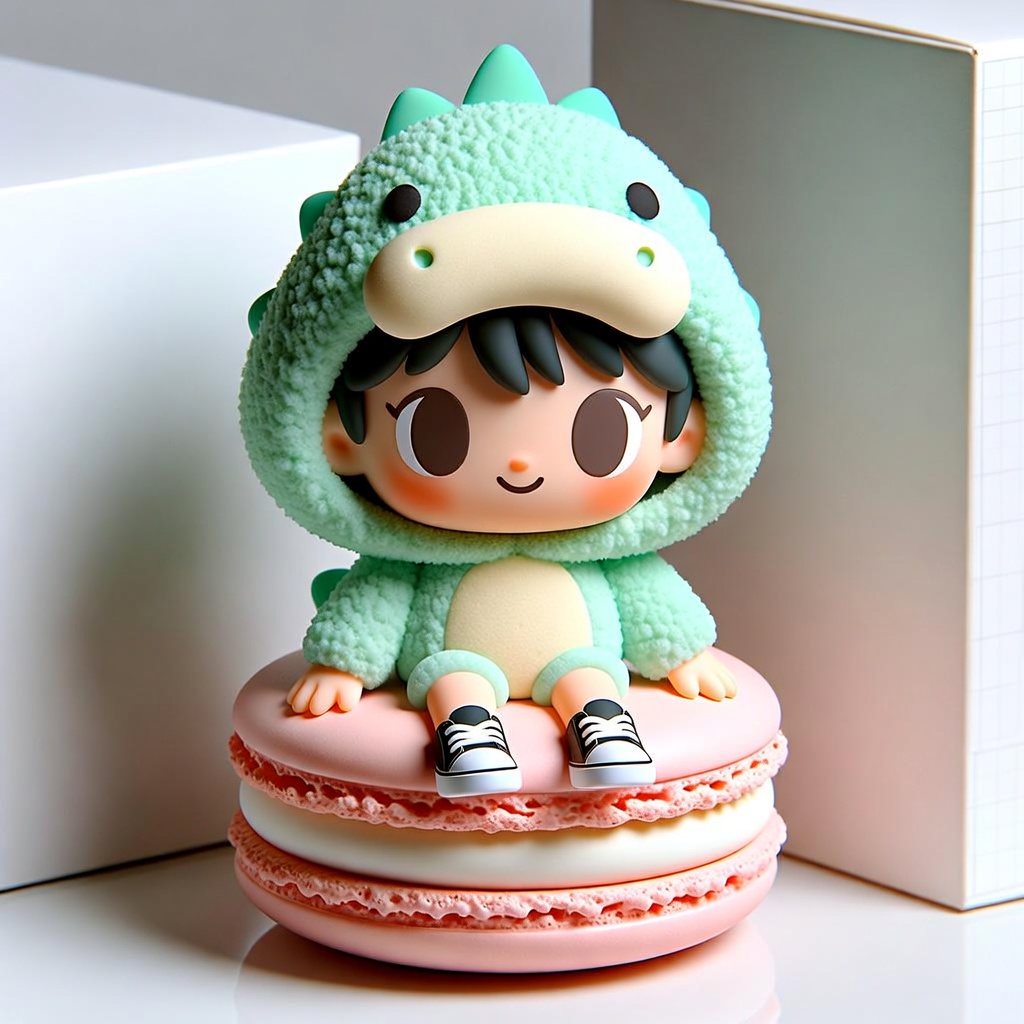 3D character design, blind box toy style. A cute chibi girl wearing a fluffy dinosaur hoodie and oversized sneakers. She is sitting on a giant macaron. Soft clay texture, matte finish. Clean pastel color palette: mint green, baby pink, and cream. Studio lighting, soft shadows, 3D render, C4D, Octane render, high fidelity, 4k.