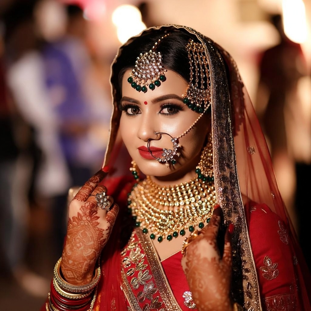Cinematic portrait of a stunning Indian woman in a traditional red Saree with gold embroidery. She is wearing intricate bridal jewelry (nose ring, heavy necklace). Her hands are decorated with detailed Henna (Mehndi) patterns. Warm, golden lighting illuminates her face. Rich, vibrant colors, shallow depth of field blurring the festive background. 85mm lens, culturally rich, masterpiece.