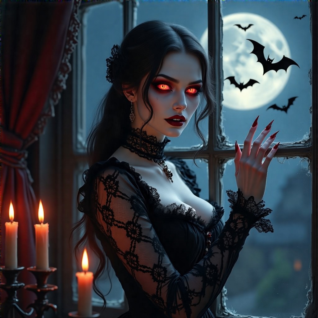 • A pale vampire woman stands at a candlelit window, crimson eyes glowing. She slowly raises her hand and taps long nails against the glass. Her expression shifts from seductive to dangerous as bats flutter past outside. Slow cinematic push-in, soft candle flicker, subtle fog, smooth motion, dramatic lighting.