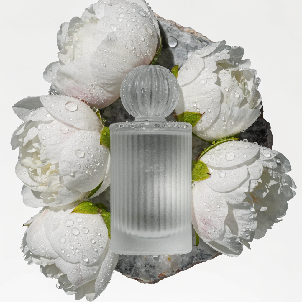 A frosted glass perfume bottle on a slab of raw marble, surrounded by scattered white peonies and morning dew drops, soft diffused studio lighting from above, product photography, clean white background, 4K