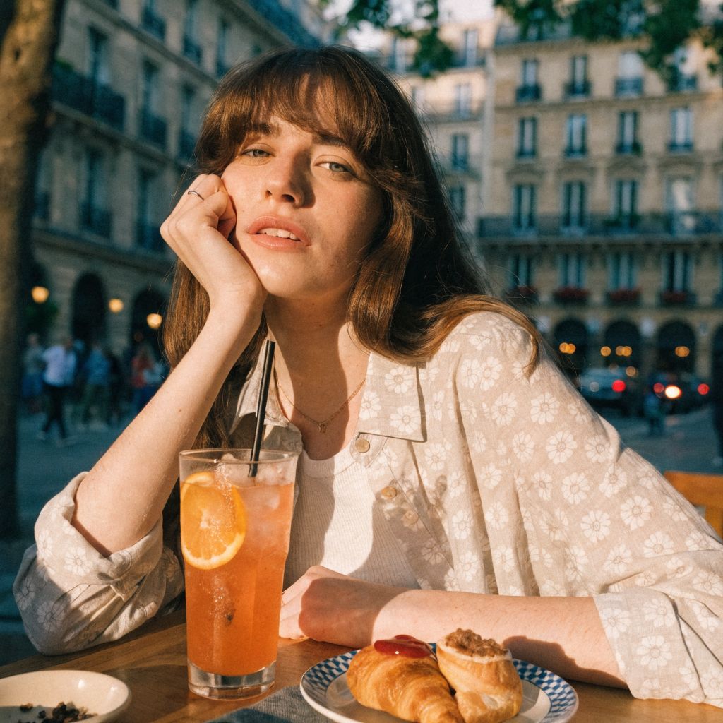 A young woman sitting in a Parisian café at golden hour, soft bokeh background, shot on Canon EOS R5, 85mm f/1.4, natural lighting, film grain