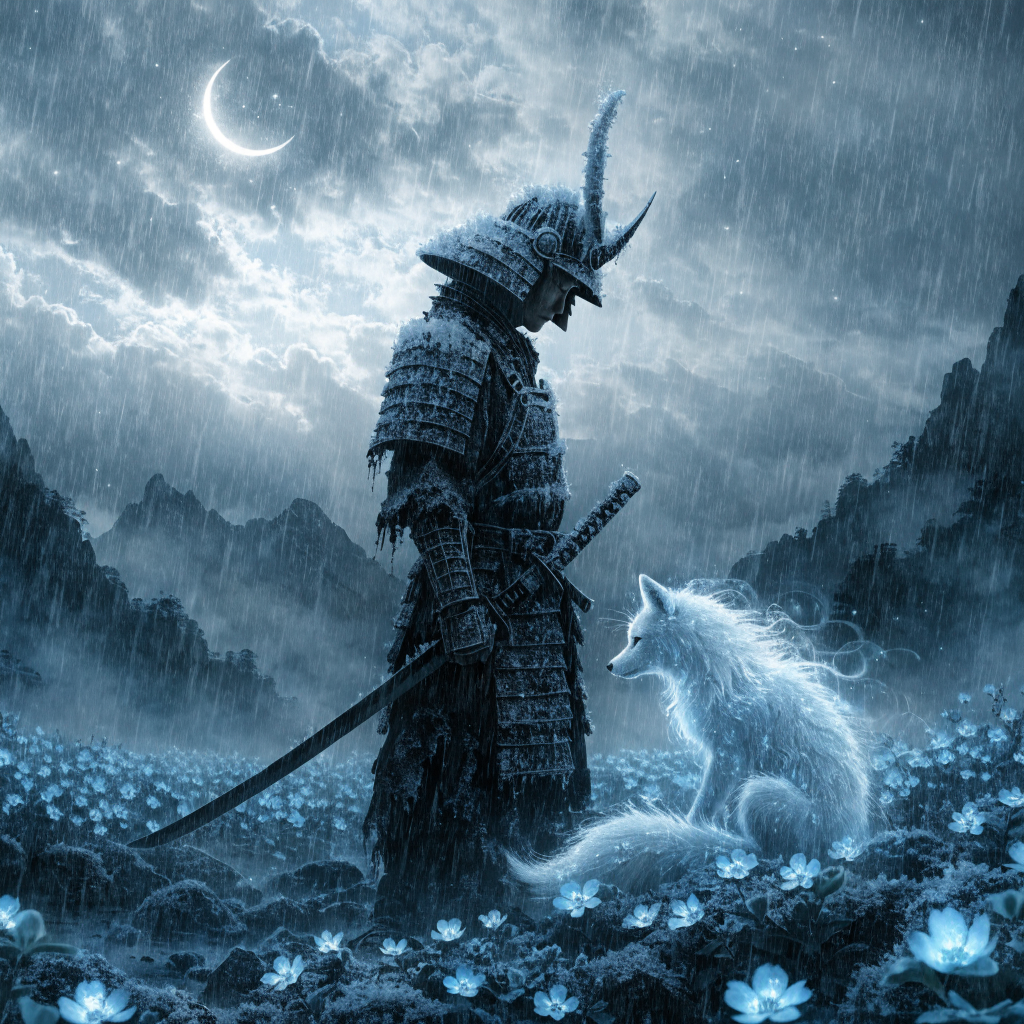 A samurai standing in a field of luminous blue flowers under a crescent moon, his armor covered in frost, a spectral white fox sitting beside him, Japanese ink wash meets digital painting