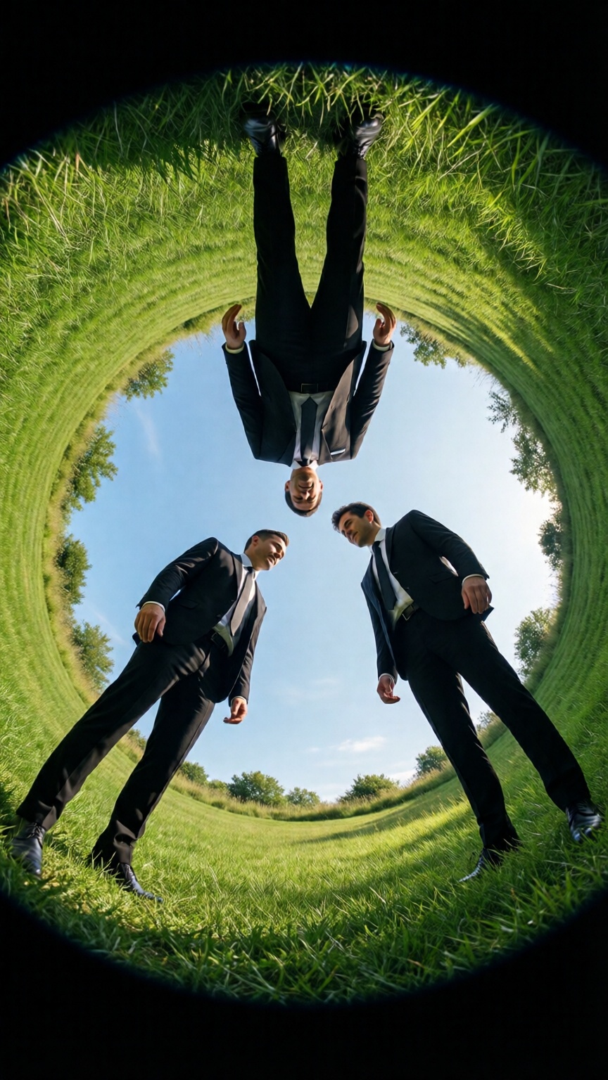 three people in black suits floating above the grassy ground, looking down at each other from different angles, seen through a circular hole in the top of a green lawn, with a blue sky and a symmetrical composition, captured with a fisheye lens in high resolution, resulting in a hyper-realistic, cinematic photographic style reminiscent of kodak film stock.